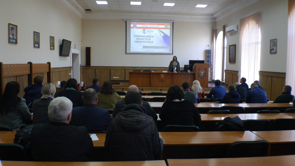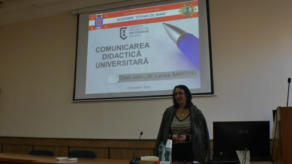 În vederea susţinerii acestei axiome, în perioada 26.09.2022-08.10.2022, dr. conf. univ. Sadovei Larisa, directorul Școlii Doctorale Științe ale Educației a Universităţii Pedagogice de Stat ,,Ion Creangă” a ţinut un curs de formare profesională continuă, intitulat: ,,Comunicarea didactică universitară”, 4 ECTS, în incinta Academiei ,,Ştefan cel Mare”.