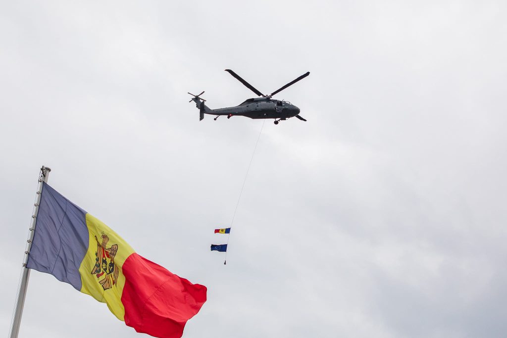 În timp ce elicopterul trupelor de intervenție poloneze survolează Piața Marii Adunări Naționale, ofițeri din cadrul BPDS „Fulger” a Poliției Naționale și camarazii lor din Polonia arborează drapelele Republicii Moldova și Uniunii Europene, deasupra capitalei țării noastre.