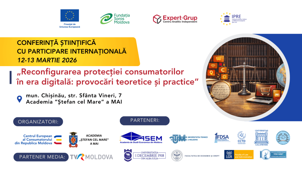 Cu ocazia celebrării Zilei Mondiale a Drepturilor Consumatorilor, marcată anual la data de 15 martie, Centrul European al Consumatorului din Republica Moldova, împreună cu Catedra Drept Privat a Facultății de Drept, Administrație, Ordine și Securitate Publică din cadrul Academiei „Ștefan cel Mare” a MAI al RM, anunță organizarea, în perioada 12–13 martie 2026, a Conferinței științifice cu participare internațională „Reconfigurarea protecției consumatorilor în era digitală: provocări teoretice și practice”, ediția a II-a.