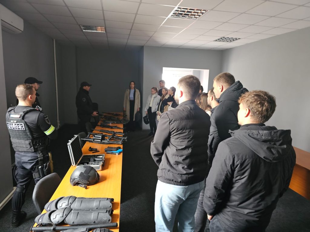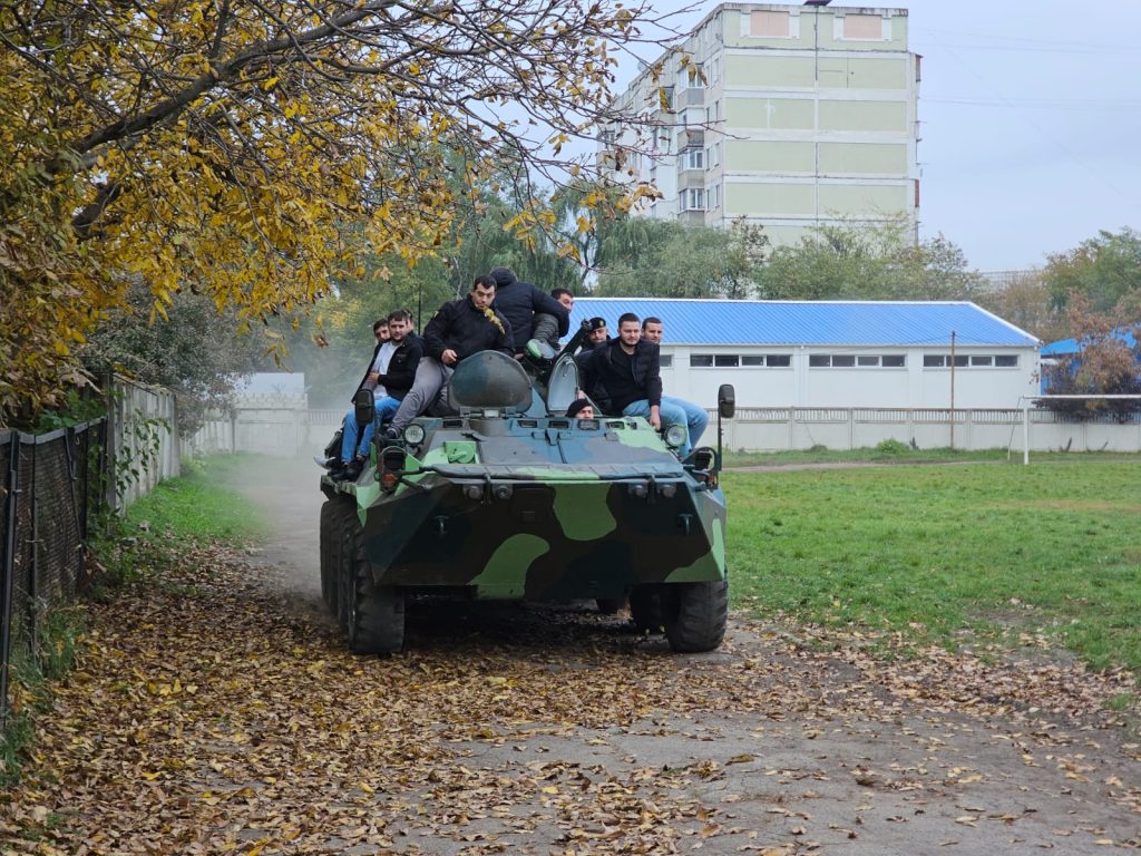 Totodată, studenții au vizitat sala de sport, în care angajații se antrenează zilnic, încăperile speciale cu arme și scuturi balistice, precum și au avut posibilitatea să facă o tură cu transportoarele blindate.